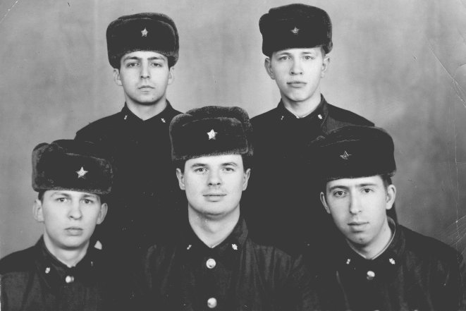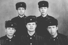 083 Питерские 2-го взвода 2-го отделения Афонасьев(верх слева) внизу Полухов, Сацков, Смирнов. 1971 год |