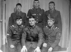 100 Григоренко А., Сергеев В., Дашков Н., Тараканов В., Чаркин, Свириденко В.(начало октября 1974г). Дембельское фото на память |