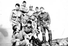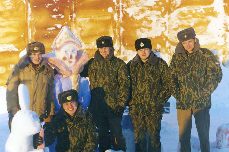 120 ОРИР ЭО "Юкона-1" на сопке Св.Михаила. справа на лево Шаповалов Николай, Иванов Александр, Андреев Владимир, сидит Казаченко Виктор, Коновалов Вячеслав. 1998 год |
