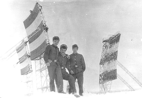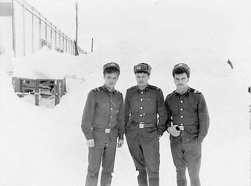 014 Мл.с-т Грейчас, ряд. Новиков, с-т Балдеско на фоне офицерского общежития |