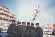 015 В техздании "Яузы". Начальник смены "Днепра" В.Ульянкин. НВО "Днепра" С.Спорягин. Начальник смены "Яузы" А.Лунякин. Весна 1999 |