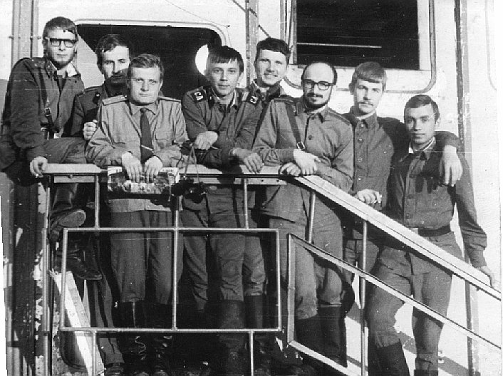 050 Виноградский, Пискунов, Судаков, Жарков, Кузьмин, Пагомий, Карпов, Донцов на входе в техздание, 1974 год.