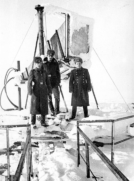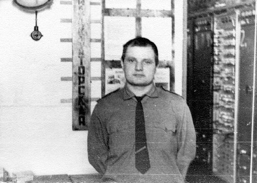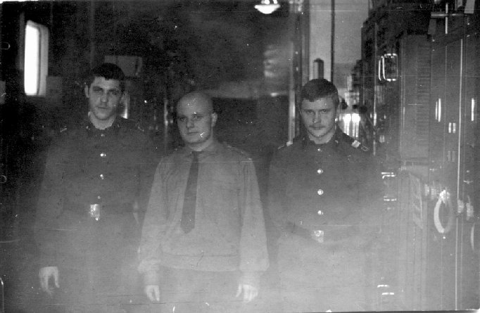 058 С-т Кондратьев, с-т Шауэр и ст. л-т Судаков на профилактике оборудования, 1975г. |