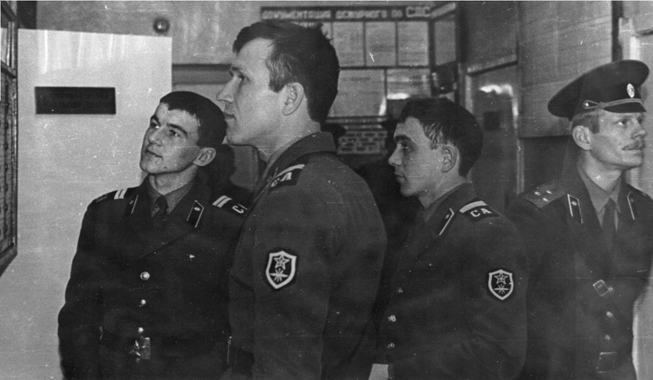 177 В учебном классе станции ДС. Мл. с-т Корчагин, мл.с-т Дубков Сергей, с-т Киямов, ст. л-т Макаркин (замполит 2-й роты). 1980 год |
