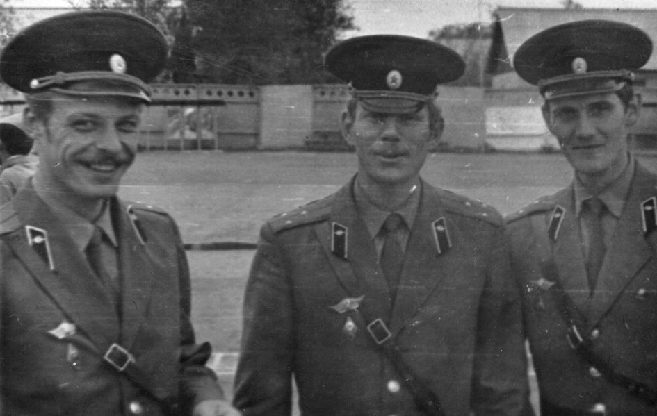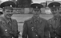 189 На плацу части. Слева - ?, ст. л-т Макаркин, ст. л-т Мутин. 1979 год |