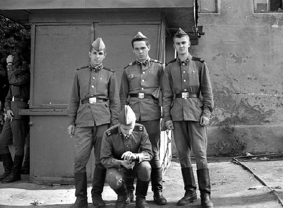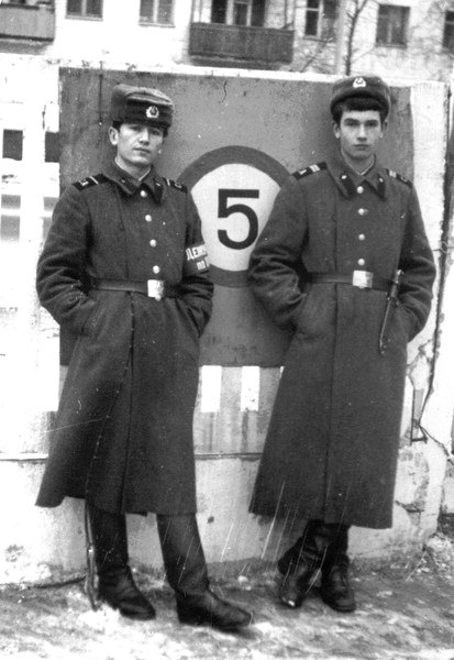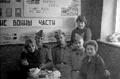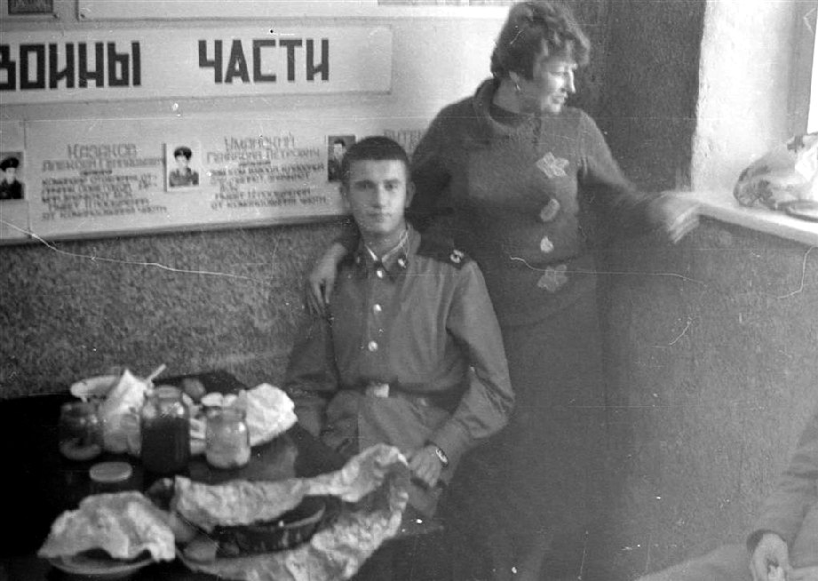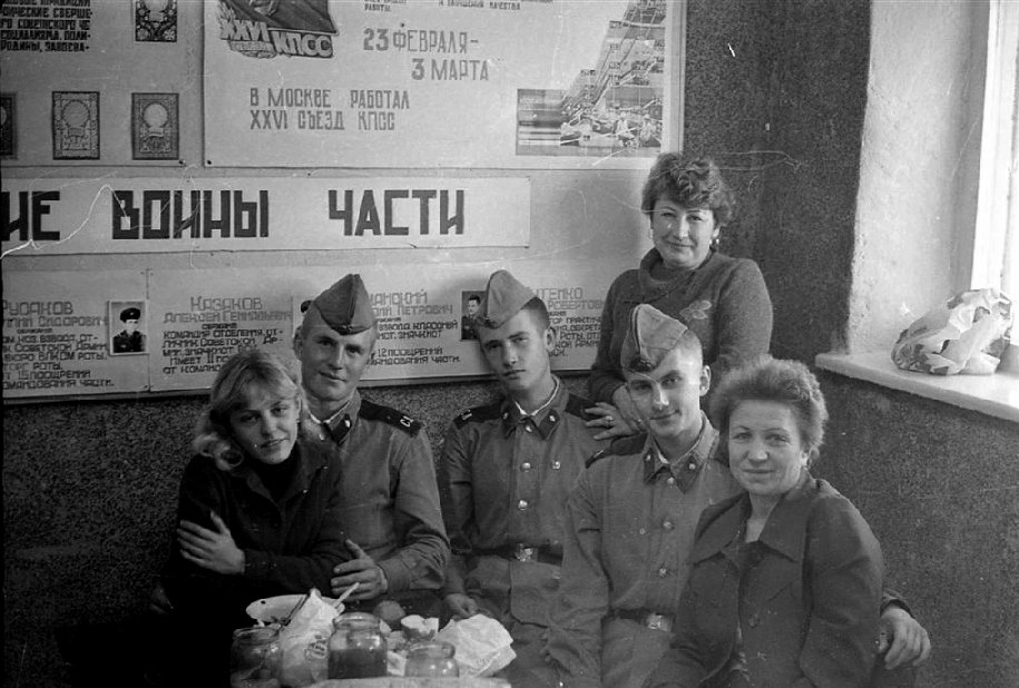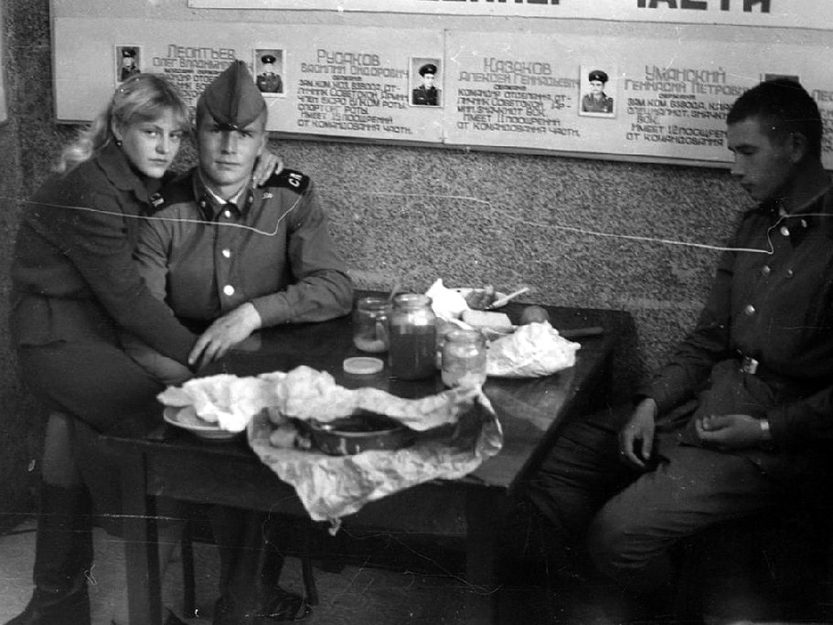 005 Актюбинск, лето 1983 года. На КПП, приезд родителй. На стенде фотография мл. с-та Русакова (второй слева) |