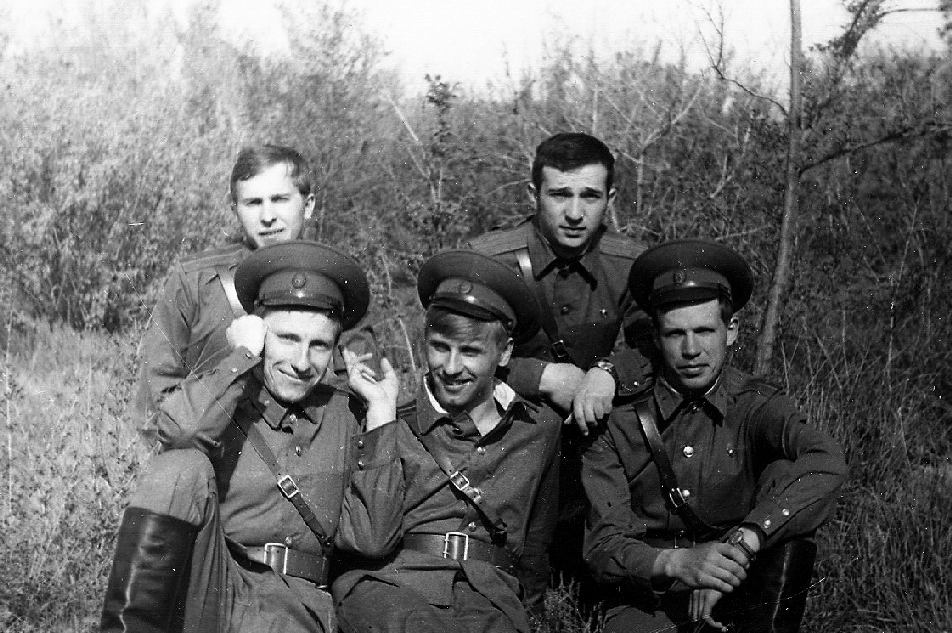040 Актюбинск, май 1974 года. Лейтенанты-минчане Стоят: Каганов и Долбик. Сидят: Щегельский, Дубко, Подобед |