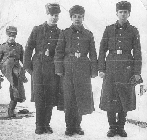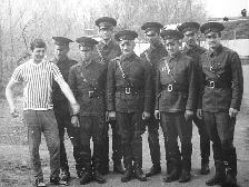083 Питерские 2-го взвода 2-го отделения Афонасьев(верх слева) внизу Полухов, Сацков, Смирнов. 1971 год |