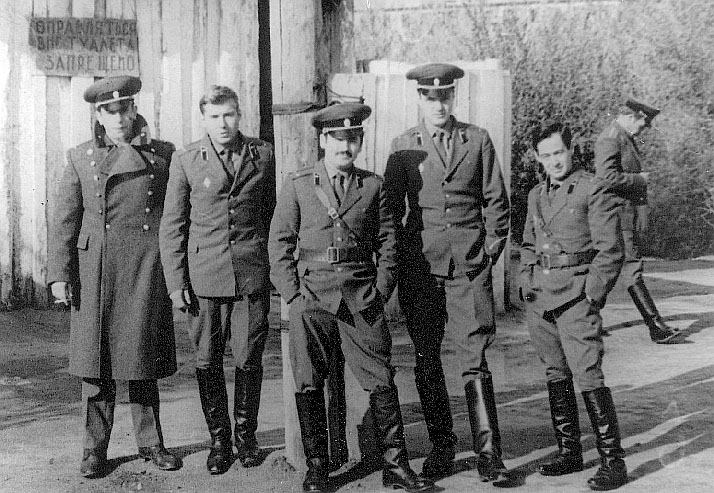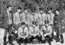 009 На плацу в учебном центре. Первый ряд слева направо: Эдик Шнайдер, Борис Хайкин (Москва), Андрей Сухачев (Москва), Валерий Сунец, ?, Евгений Потаев(Минск), Михаил Чайковский(Минск) Второй ряд ?, Лев Ченяк, Яков Фрейдлин(Москва), Ситников(Ленинград), ? |