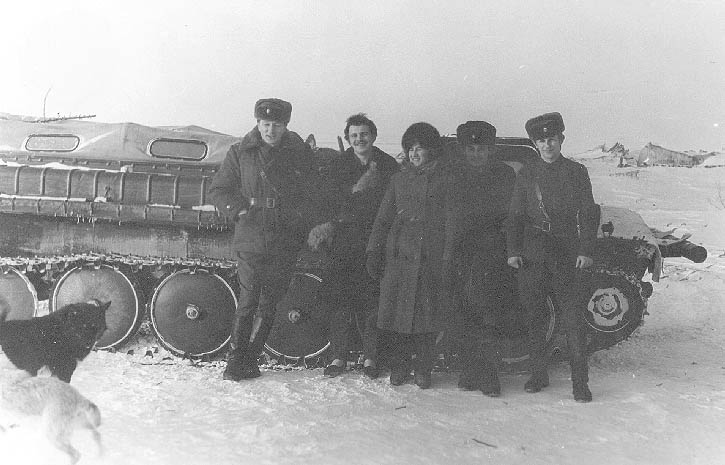 041 Встреча регламентной группы "Амура-1". К-н Лобановский, ст.л-т С.Павлюков, Зоя Островерх (бухгалер "Алмаза"), пр-к Кобзев и л-т В.Мелекесцев. Зима 1984 года |