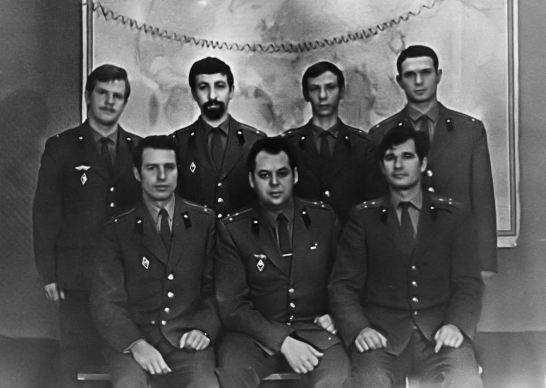 085 Офицеры станции "Алмаз".Сидят: Клёнов, Черников, Зайцев. Стоят: Баранов, Зарецкий, Данилов, Березин. Декабрь 1971 |