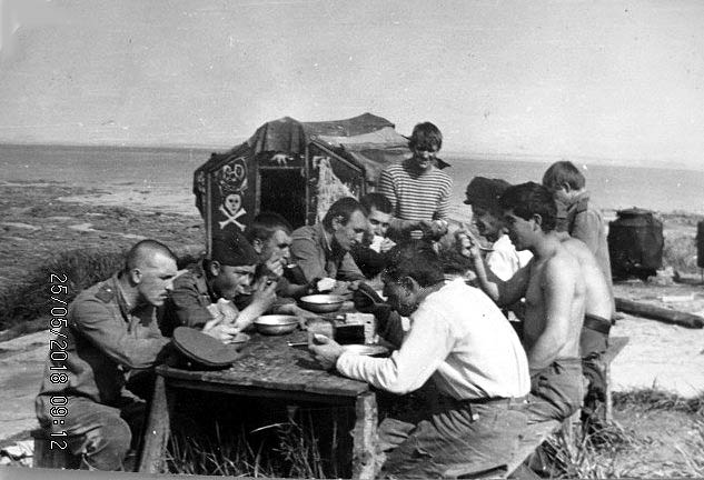268 Обед на "Японке". Во время съемки на море - отлив. 1968 год |