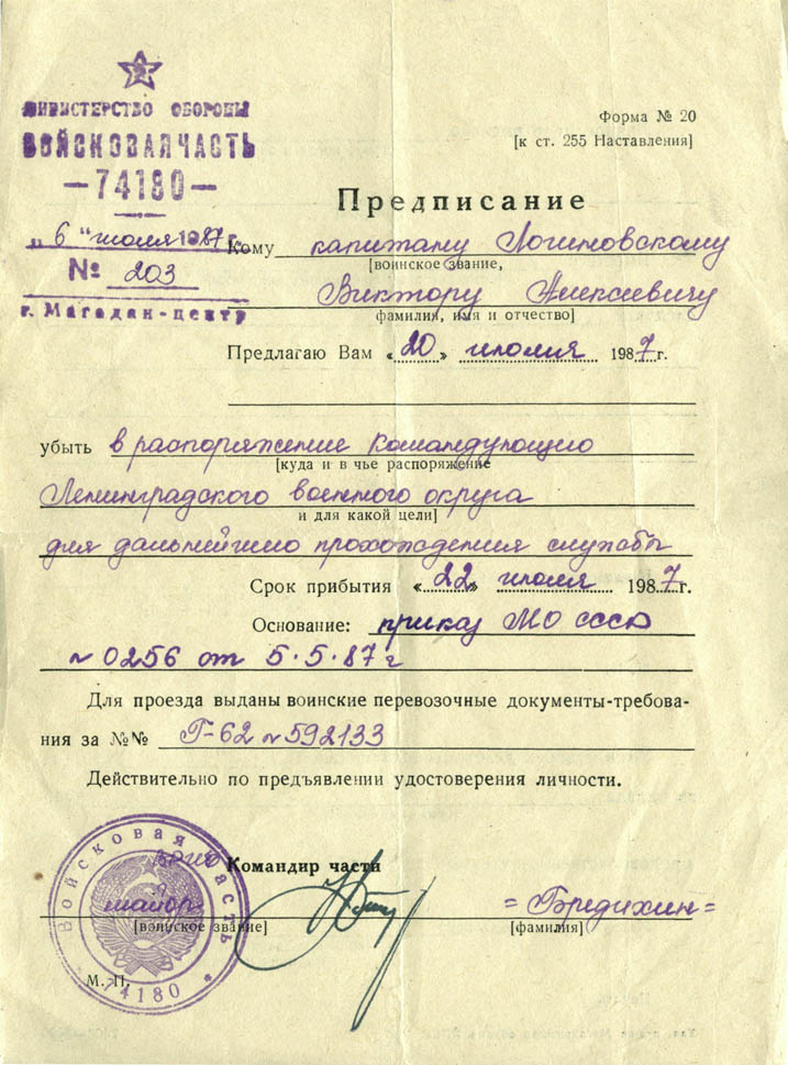гор. Магадан. Позывной - "Дракон-1". В/ч 74180