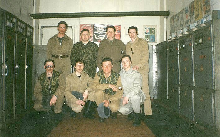 043 щитовая дизельной, слева на право (стоящие) 236 Горького Сонин, 293 Юкона-1 Иванов Александр, 410 Горького Парфенов Сергей, нач.смены Горького Криворучко, слева направо сидящие: 236 Горького Козлов Валерий, 420 Юкона-1 Громогласов Вячеслав, 420 Юкона-1 Нигрей Александр, 236 Горького Ивашков. 1997 год |