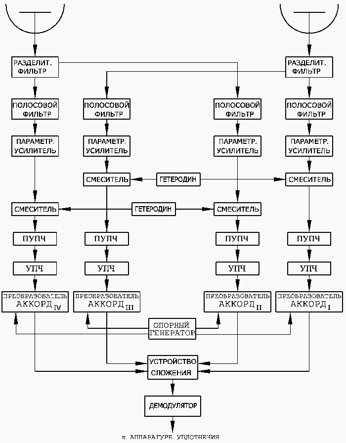 Структурная схема приемного устройства при счетверенном приеме, с преобразователем "Аккорд"