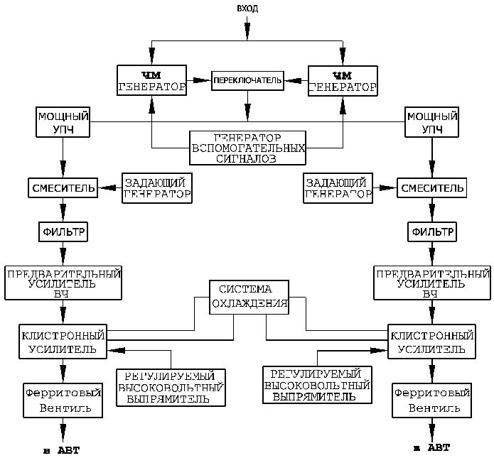 Передающее устройство состоит из двух одинаковых передатчиков, работающих на разных частотах. Общим для обоих передатчиков является частотномодулированный генератор, который для обеспечения высокой надежности резервируется. Одновременно с полезным сигналом на этот генератор подаются синусоидальные колебания частотой 1 МГц от вспомогательного генератора. Составной ЧМ сигнал промежуточной частоты 70 МГц усиливается в мощном усилителе промежуточной частоты и поступает на смеситель. На другой вход смесителя подается СВЧ сигнал, полученный умножением частоты сигнала задающего генератора с кварцевой стабилизацией. Фильтр выделяет необходимую полосу частот после смесителя. После фильтра СВЧ сигнал усиливается в предварительном усилителе, затем поступает на клистронный усилитель с коэффициентом усиления 40 дБ. Для согласования выхода клистронного усилителя с волноводным трактом используется мощный ферритовый вентиль. Сигналы с выходов передатчиков по волноводным трактам поступают к рупорным облучателям антенн. Управление выходной мощностью клистронного усилителя осуществляется путем изменения анодного напряжения клистрона. Для этого используется оригинальной конструкции высоковольтный выпрямитель с изменяемым выходным напряженим. Максимально возможное напряжение этого источника питания - 9 кВ. В передатчиках системы «Горизонт-М» использовались пролетные 4-х резонаторные клистроны "Виноград" с водяным охлаждением 2-х типов: с максимальной выходной мощностью 3 кВт и 5 кВт. Для фокусировки электронного луча клистрона использован внешний электромагнит составленный из 4-х секций. Водяная рубашка охлаждения клистрона подключалась к общей системе водо-воздушного охлаждения через датчик контроля водяного потока (гидрокнопка).