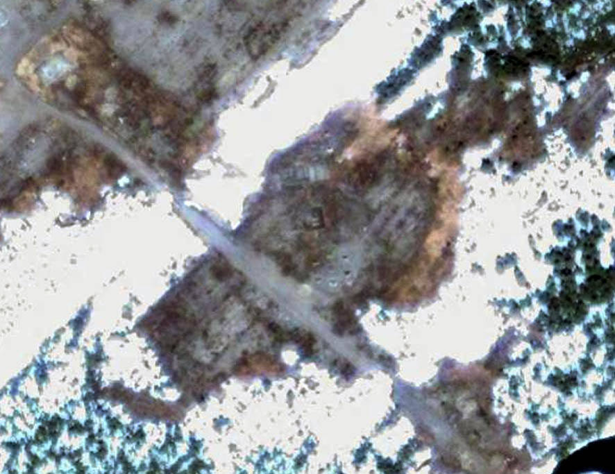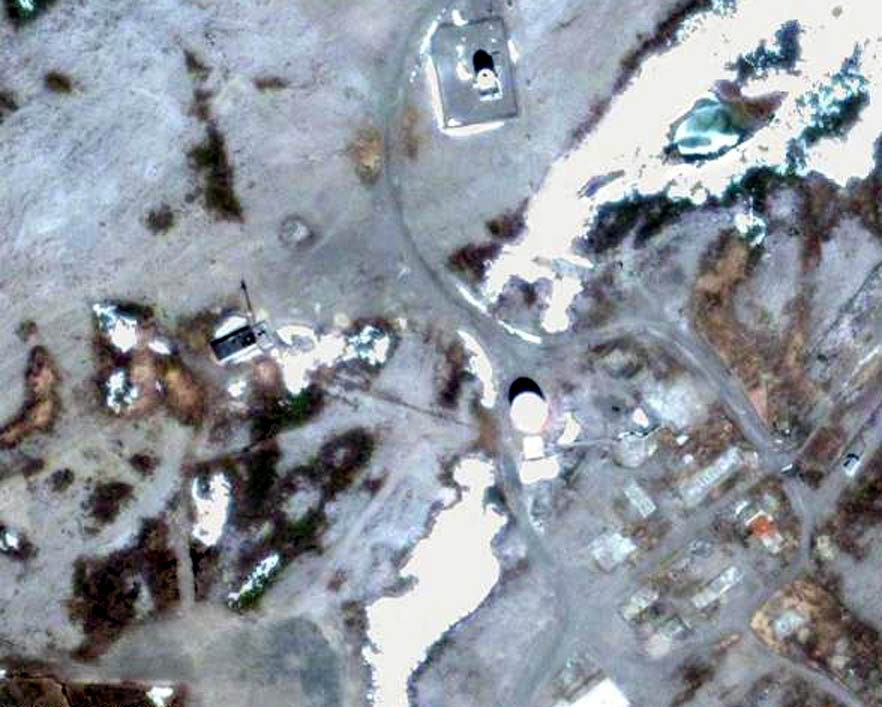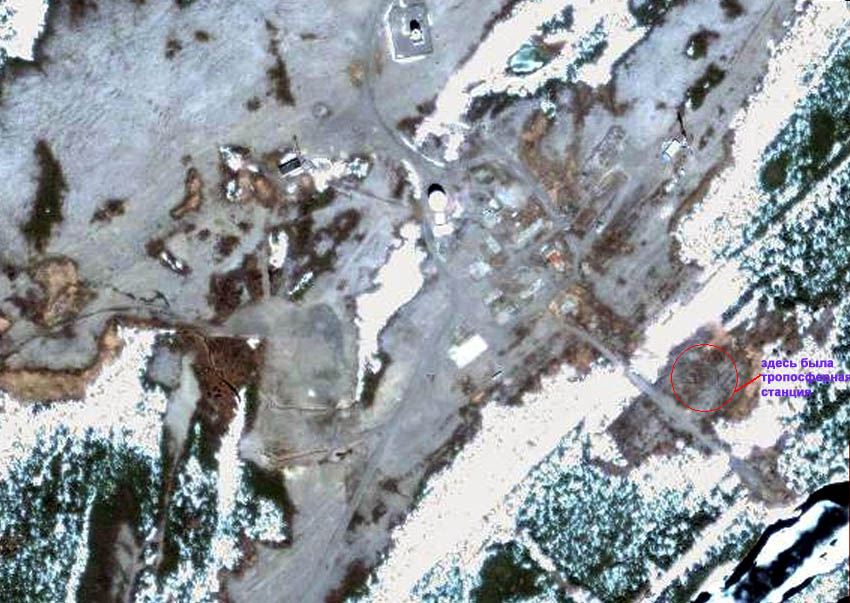 На нижнем снимке участок, где располагалась тропосферная станция. Можно видеть фундаменты двух антенн, техздания и дизельной