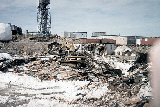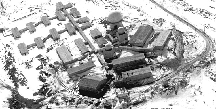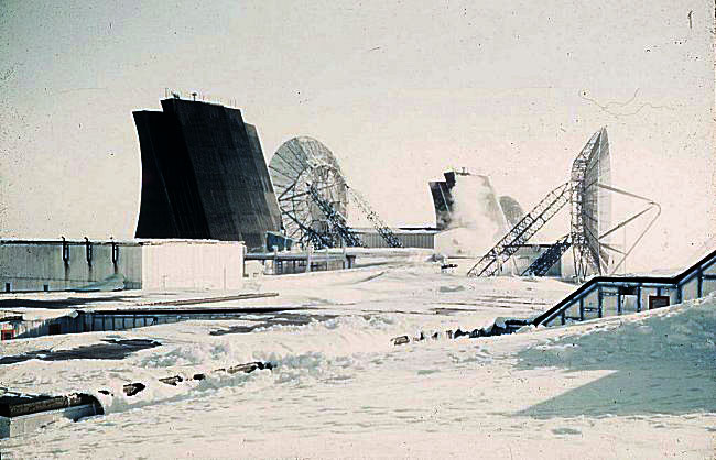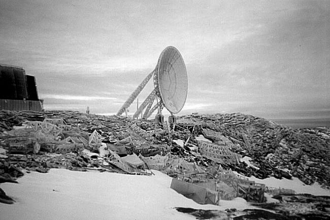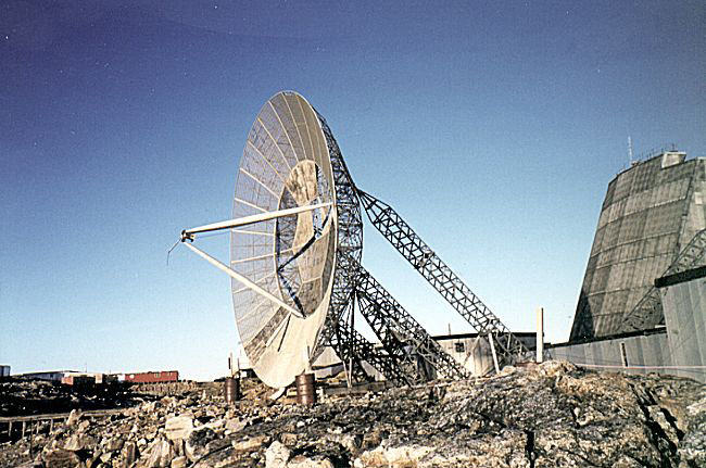 001 12 метровая антенна тропосферной станции. Ниже можно видеть останки прежней разрушенной антенны. Снимок 7 июля 1999 года |