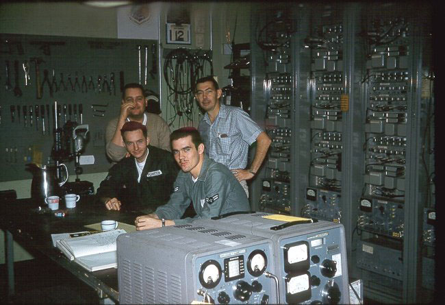 023 Июль 1961 года. В техздании тропосферной станции Polevault. Двое гражданских - это техники канадской компании Маркони. Справа - стойки возбудителей передатчиков. |