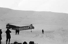 015 Вертолет американских ВВС перевозит грузы и людей с нижней площадки на верхнюю. Декабрь 1955 года |