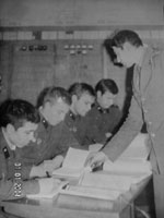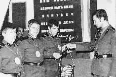 103 Комсорг части л-т Жданов вручает переходящий вымпел лучшей смене магистрального Савичева. 1-й слева техник ДС мл. с-т Александр Поздеев, 2-ой - техник РРС ряд. Петр Авдеев. |