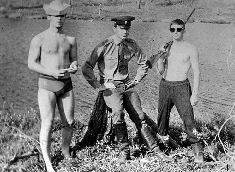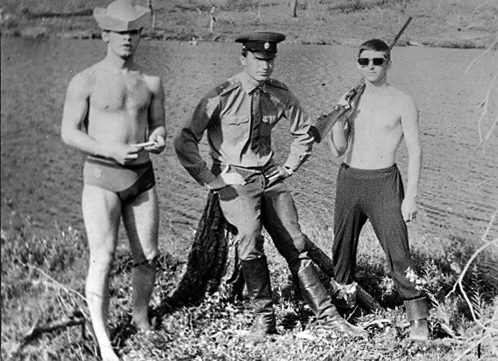 100 Один из редких дней отдыха, можно позагорать, искупаться. Слева - Савичев, справа - Шмыга. Ружье на тот момент единственное огнестрельное оружие в части, при отъезде мы оставили его преемникам |