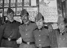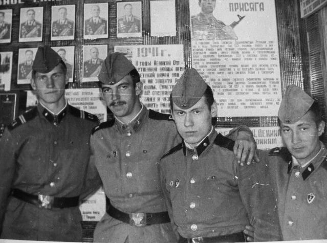 107 В ленинской комнате. Старшина Скунстиньш, Чура, Набиулин и парнишка из Узбекистана. 1981 год |