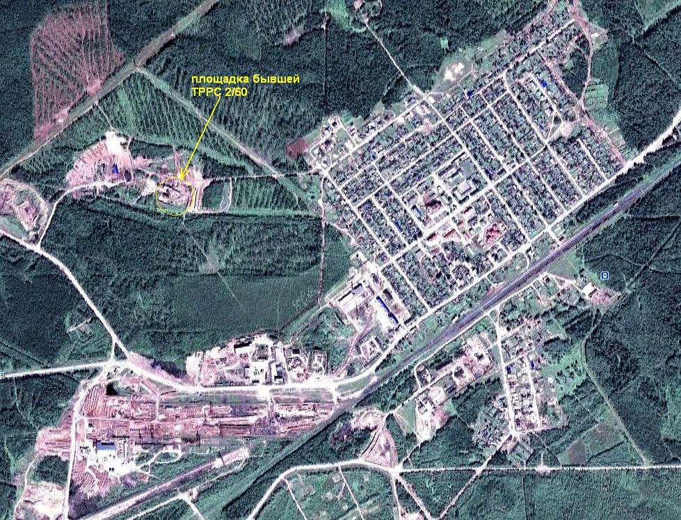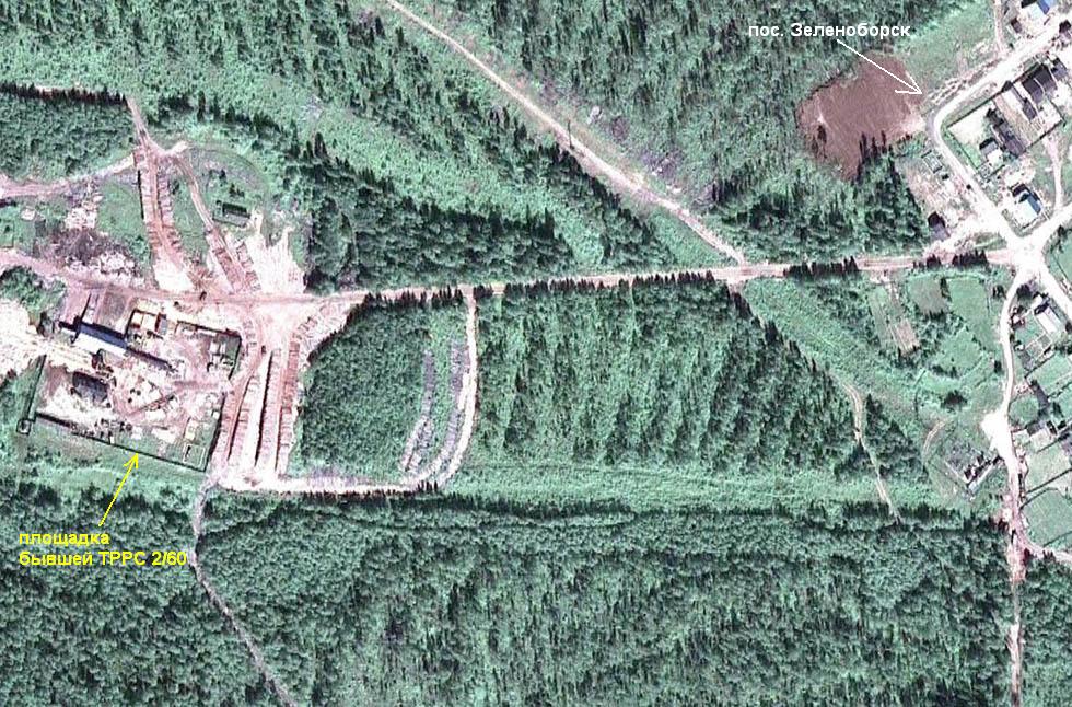 На этом снимке площадки бывшей ТРРС 2/60 показано примерное положение антенн станции. В настоящее время на территории бывщей тропосферной станции находится предприятие по переработке древесины. Из прежних зданий сохранился гараж.