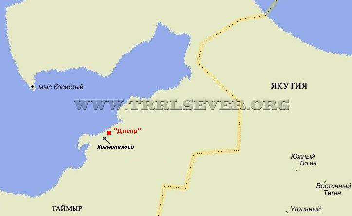 "Днепр" промежуточная станция, которая работала на два направления: на западе -"Яуза" (пос. Хатанга) и на востоке -"Графит" (с. Таймылыр). Станция располагалась на холме высотой около 30 метров в двух километрах к востоку от заброшенного поселка Кожевниково. От берега залива - 800 метров. До мыса Косистого - 22 километра. Расстояние до "Яузы" - 310 км, до "Графита" - 387 км. Географические координаты - 73,567 СШ 110,333 ВД. Это самая северная станция системы. Зимой самолеты садились прямо на лед залива вблизи станции.