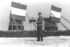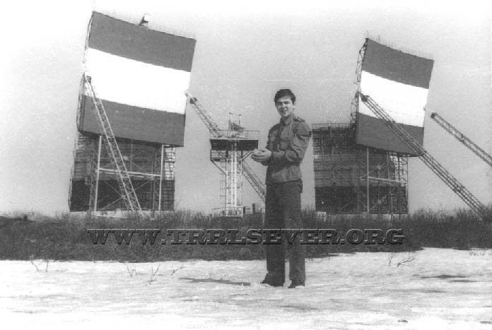 020 Июнь 1986 года. Последний снег. Л-т М.Козлов на фоне антенн северного направления (на "Полоску")