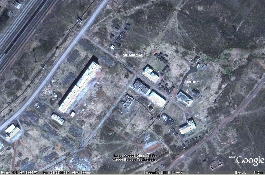 Начать нужно, пожалуй, с того, что когда началось строительство ТРРС 5/60 народ в поселке был уверен. что в тундре строят ракетную шахту. Такое мнение основывалось на том, какое количество бетона возили на стройплощадку и сколько техники было брошено на этот объект. Весь этот бетон действительно ушел в землю - глубина фундаментов для антенно-мачтовых сооружений ТРРС 5/60 - 8 метров. Причем возили все необходимое для строительства станции прямо от станции по тундре - никакой дороги не было, дорогу к релейке постороили только через несколько лет. Кроме АМС на площадке были построены техздание и дизельная-котельная. Других зданий на станции не было. По первоначальному проекту не предусматривалось, что кто-то должен жить на станции. Для обслуживающего персонала станции был постороен двухэтажный 16-ти квартирный кирпичный дом в поселке Мульда(ул. Товарная дом 2). Этот дом и сарай возде него и по сей день стоит на старом месте как и 40 лет назад. Сегодняшний снимок со спутника здесь. Фактически, Мульда - это поселок железнодорожников, который вырос около железродорожной станции Мульда. В поселке всего четыре улицы: ул Камова, ул. Красина, ул Соединительная и ул. Товарная. На Мульде находится весовая станция. Здесь производится взвешивание вагонов с углем. Затем эти вагоны подаются на станцию Мульдя, где из них формируются составы. Через Мульду проходит 80% добываемого на воркутинских шахтах угля. В поселке были клуб, два продовольственных магазина, почта, амбулатория, большой овощной склад, котельная, баня, два детских сада. Ежечасно ходил автобус до Воркуты (№102). Дорога до города занимала в хорошую погоду один час. Больше половины населения поселка в середине 70-х годов составляли бывшие заключенные. Снимок 2006 года поселка со спутника здесь