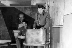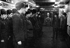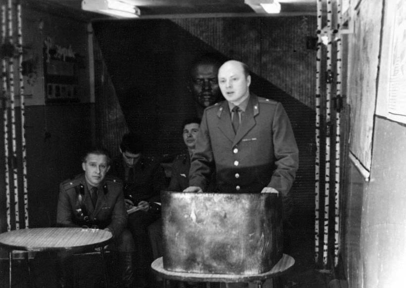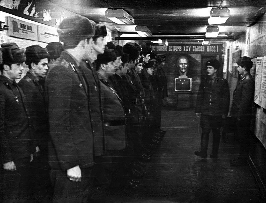 113 Инструктаж заступающей смены проводит командир м-р Осетров. Слева ст.л-т Юсупов, пр-к Токмянин, с-т Савченко, ... 1975 год |