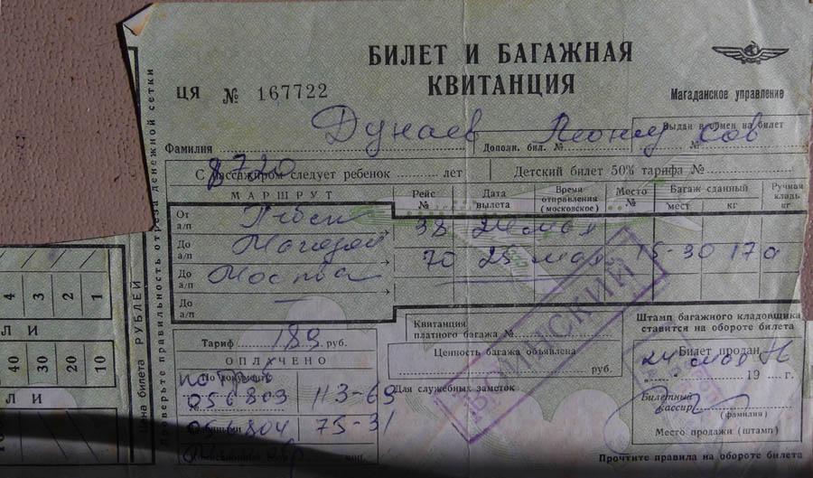 Билет Леонида Дунаева "Певек-Магадан-Москва". 24 мая 1976 года