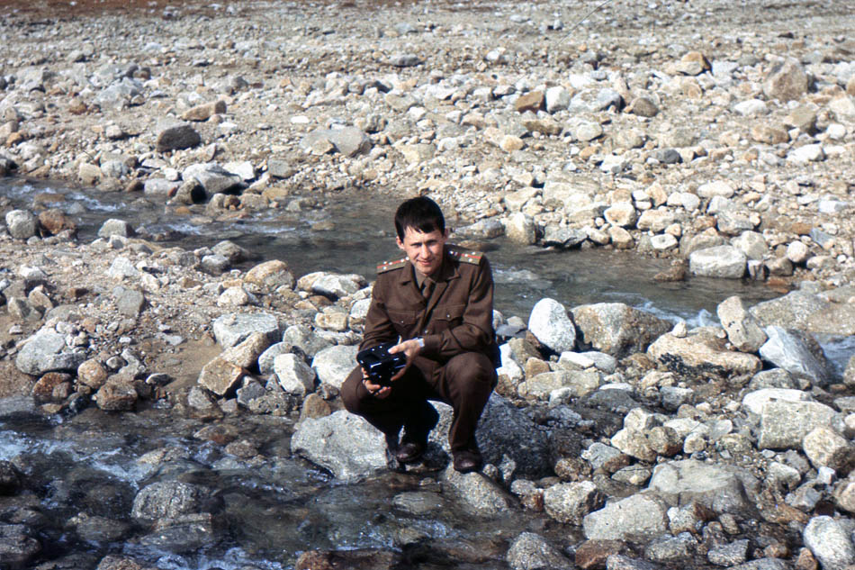 104 Инженер-метролог "Дракона-2" Валерий Колдаев. Внизу, под сопокй "Граната" протекает речка. 1988 год |