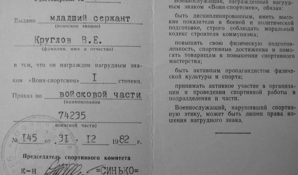 Удостоверение к знаку "Воин-спортсмен"