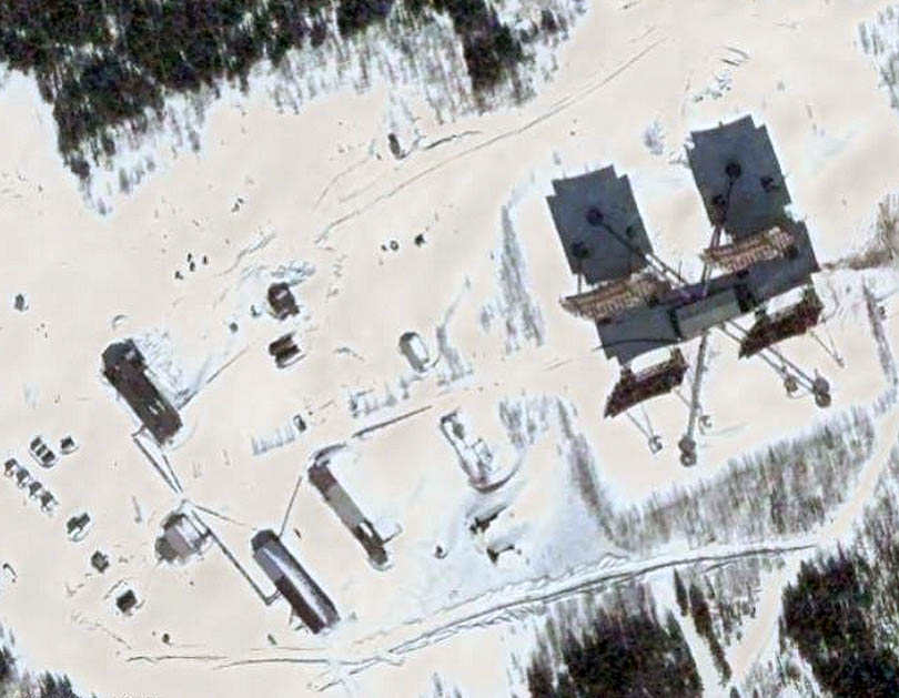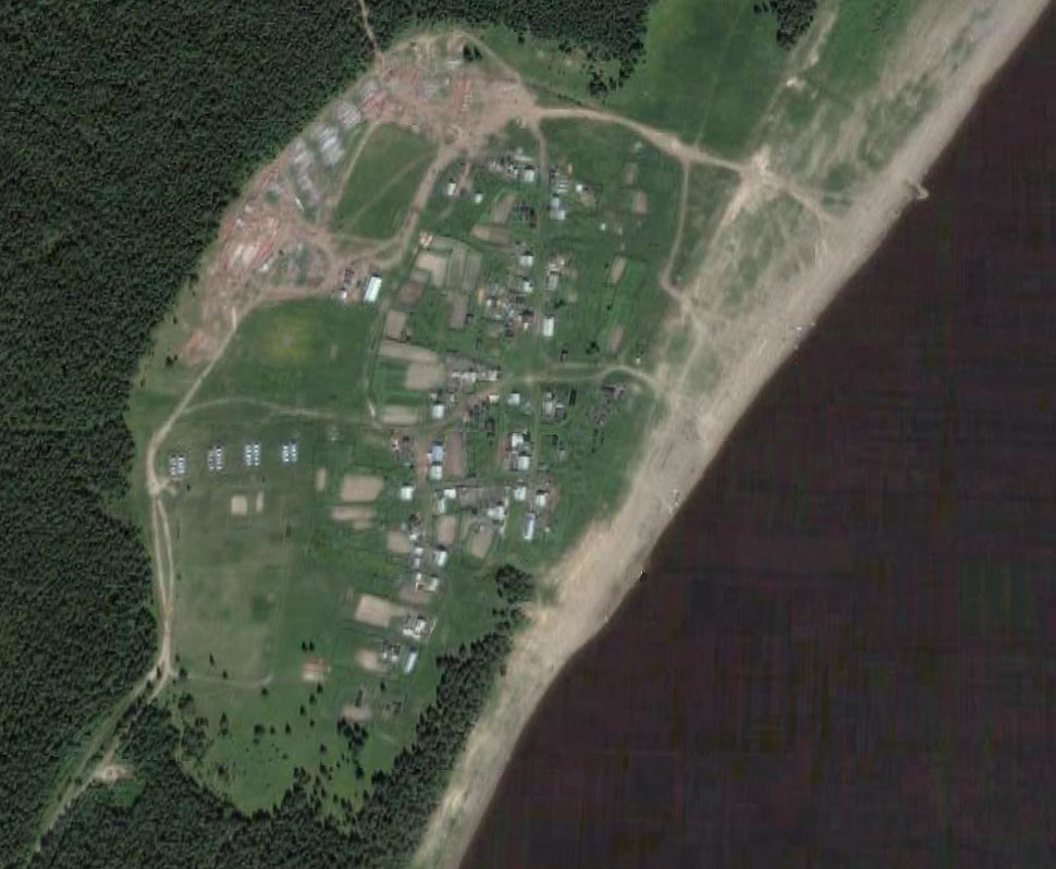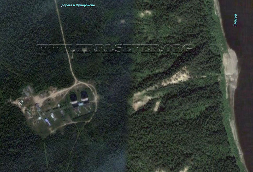 Вторая станция ТРРЛ-101 располагалась на горе у левого берега Енисея. Когда начиналось стротельство этой станции никаких путей на эту гору по суше не существовало. Для того, чтобы доставить на макушку горы все необходимое для строительства тропосферной станции была построена КАНАТНАЯ ДОРОГА от небольшого пляжа на Енисейском берегу (с правой стороны снимка) до верхушки горы. Строительные материалы, металлоконструкции, емкости для топлива, дизельгенераторы, аппаратура "Горизонт", оборудование для кухни, для жилых помещений и т.д. и т.п. - все было втащено на гору с пляжа с помощью канатной дороги. Доставлялось все необходимое, естественно, по воде, по Енисею. Однако от станции впоследствии была проложена дорога до села Сумароково, которое находится в 7-ми км к северу от станции (вниз по течению Енисея) и поэтому часто можно слышать о ТРРС 10/101, что она располагалась у Сумароково. Аэропорт находится в поселке Бор. Напротив поселка Бор, на противоположном берегу Енисея нахдится село Подкаменная Тунгуска. Здесь река Подкаменная Тунгуска впадает в Енисей.