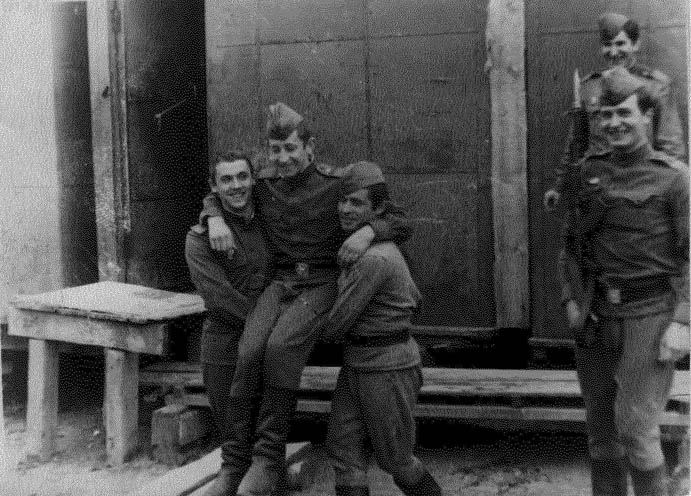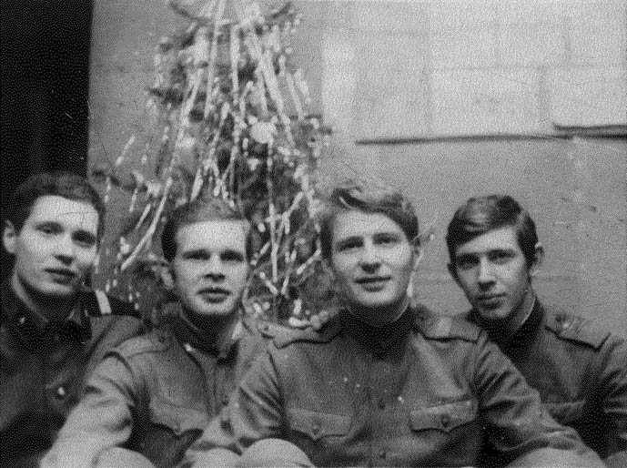 105 Смена возле техздания. Осень 1971 года. Слева на право: с-т Филиппов А., с-т Симанский Н., л-т Белонович С., с-т Гвозденко Б. |