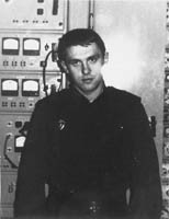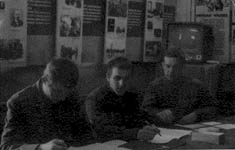 103 Смена перед выходом на дежурство. Слева на право: Шац С. - техник РРС, Емельянов О. - техник-энергетик, Гвозденко Б. - техник РРС, Филиппов А. - техник РРС. 1971 год |