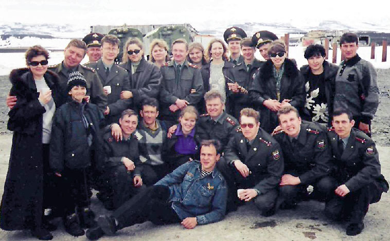 Капитан Винокуров Валера - закрыл глаза (ПМТО командира части), женщина с ребенком рядом - не помню кто; прапорщик Ефименко Сергей (начальник службы ГСМ части)- чуть в глубине; ст. лейтенант Иванов Сергей (инженер- механик) с супругой Галиной в темных очках под руку, командир п/полковник Качейкин Алексей Генрихович; за его спиной стоят дамы-супруга и одна из дочерей замполита части, имен, к сожалению, не помню, под руку держится женя начальника расчета- энергетика «Агата» лейтенанта Калинина Андрея; с шашлычком в руках он сам; за последней парой стоит лейтенант …..(ФИО не помню, т.к. прибыл недавно в часть) начальник расчета «Агата»; далее за свою супругу Оленьку (тоже в темных очках) спрятался я – ст. лейтенант Сапегин А.В.- заместитель начальника РРО «Редуктор»; последняя пара сержант-контрактник Николаев с супругой, имен, к сожалению, не помню (служил водителем).