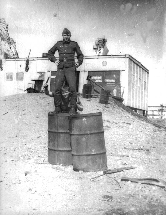 204 У ДГК: сантехник Веров (на бочке) и дизелист Пергунов. Оба из Куйбышева. 1978 год |