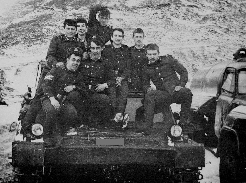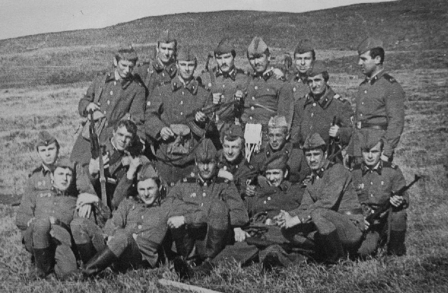 076 На незаменимом ГТТ. Спереди: Поставан, мех. РРС Виктор ?, водитель ? На втором плане: Реул А., Нарейко Г., Сейфулин , Гераськин М., Потрываев В. Весна 1982 года. |