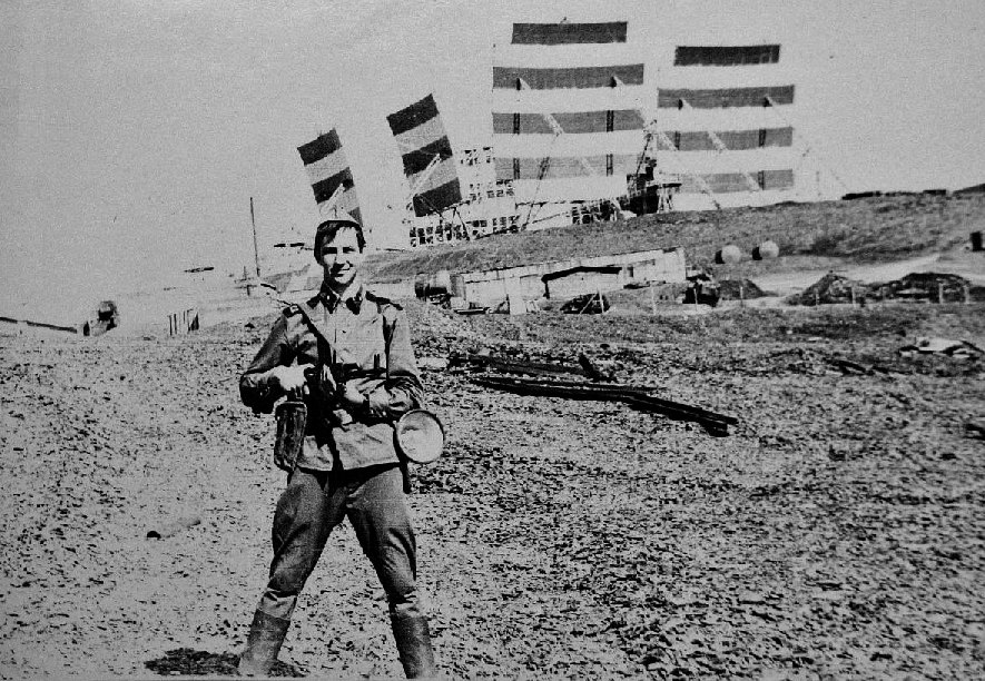 079 Техник ДС Ротар Анжело, на фоне антенн тропосферной линии Тикси - Депутаский. Лето 1982 года |