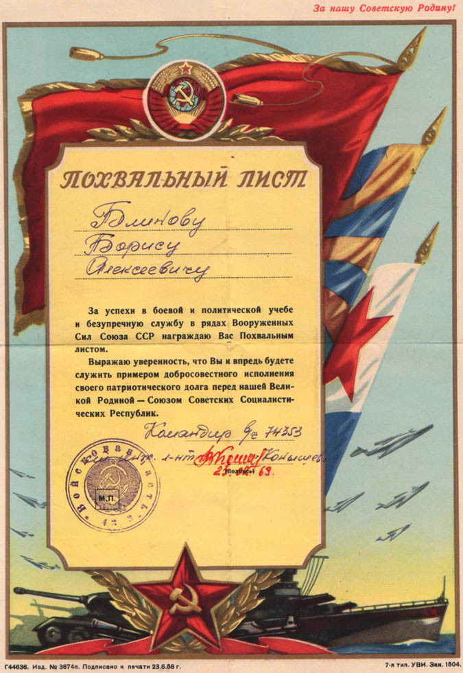 Вот чем награждали в те годы (1968-69). Борис послал это родителям, чтобы успокоить и порадовать и они сохранили.