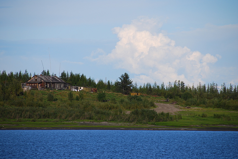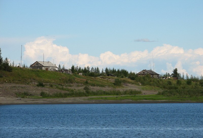 041 Село Джарджан. На окраине села видно здание метеостанции (слева). Основные же дома скрываются на холме, в зеленой чаще листвениц |
