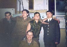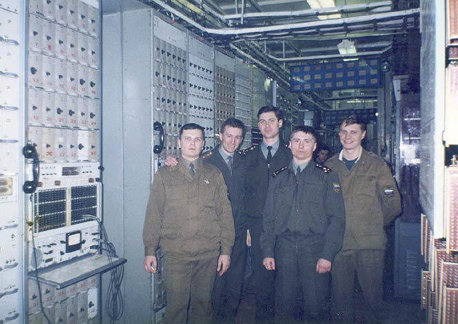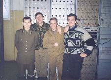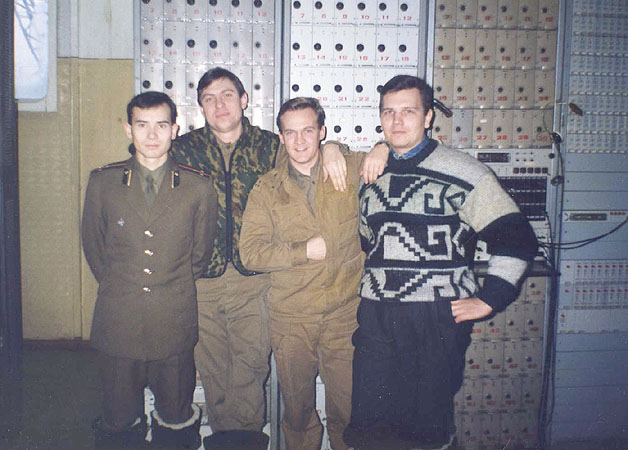038 Юрий Миронов, Дмитрий Пудышин, Алексей Гусев, Сергей Моторыга и Андрей Сухоруков в техническом здании. 1998 год.