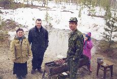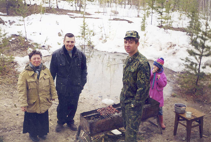 035 9 мая. Фельдшер Галина Александровна, Юрий Миронов и Алексей Гусев. Место за антенным полем, где всегда проходили «мероприятия». 1998 год |