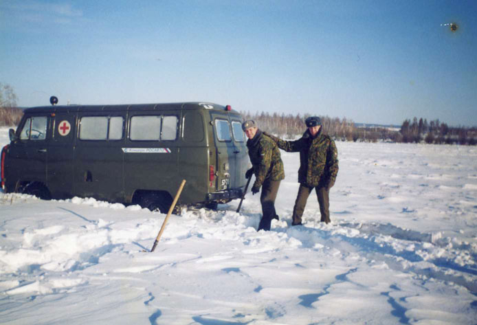 036 Дорога Жатай – «Вена». Долина «Туймада». Алексей Гусев и Дмитрий Пудышин откапывают УАЗик. 1998 год |