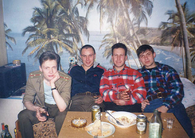 037 Евгений Зима («Амур»), Игорь Бисенов («Дон»), прапорщик с «Дона» (фамилия?) и Алексей Гусев. В общежитии нефтебазы в Жатае у Алексея Гусева. 1994 или 1995 год.
