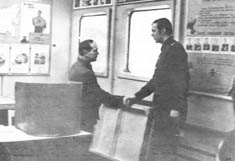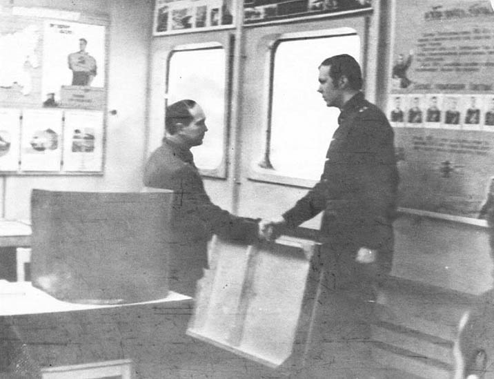 008 Командир к-н Э.Осетров поздравляет В.Самочернова с присвоением очередного звания. 1974 год