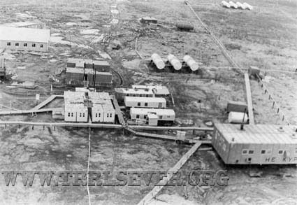 Станция "Волга". Весна 1978 года. Вид с антенн.Слева вверху кусок строящейся казармы. Справа, с надписью "НЕ КУРИТЬ" ДГК. В центре: слева 8 жилых кунгов, ближе к теплотрассе - клуб, чуть выше продовольственный склад, выше столовая. Наверху справа - емкости для дизтоплива, а также свино-ферма где держали стадо хрюшек.